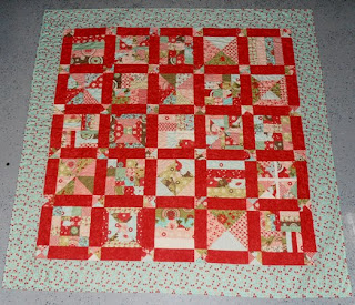 Wow, another one down. I started this quilt in 2010. It was a class called Fun with Precuts, where we could take along any precut fabrics - charm packs, layer cakes, jelly rolls, etc, even eighths or fat quarters in a design range. I started with 1 layer cake, 3 charm packs and some yardage from the Bonnie and Camille range - Bliss. Love these colours. From that fabric I have finished this quilt and have the blocks of a second quilt almost pieced.